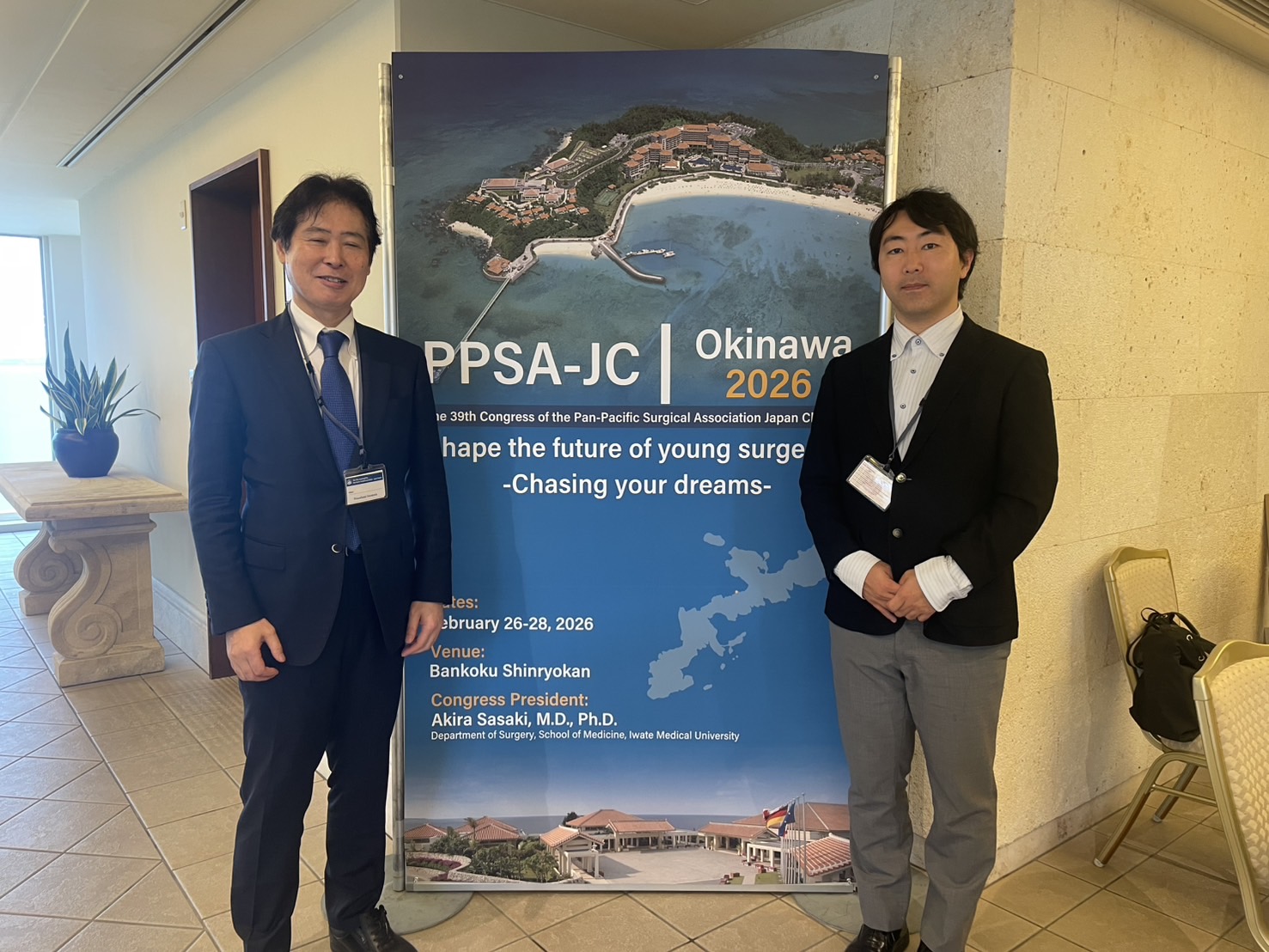 2026.03.02The 39th Congress of the Pan-Pacific Surgical Association, Japan Chapter: PPSA-JC参加しました。 2026年2月26-28日に第39回パン・パシフィック外科学会日本地方会(The 39th Congress of the Pan-Pacific Surgical Association, Japan Chapter: PPSA-JC)はが沖縄で開催され、藤田大学院生、猪股教授が参加しました。 前へ 次へ 一覧へ